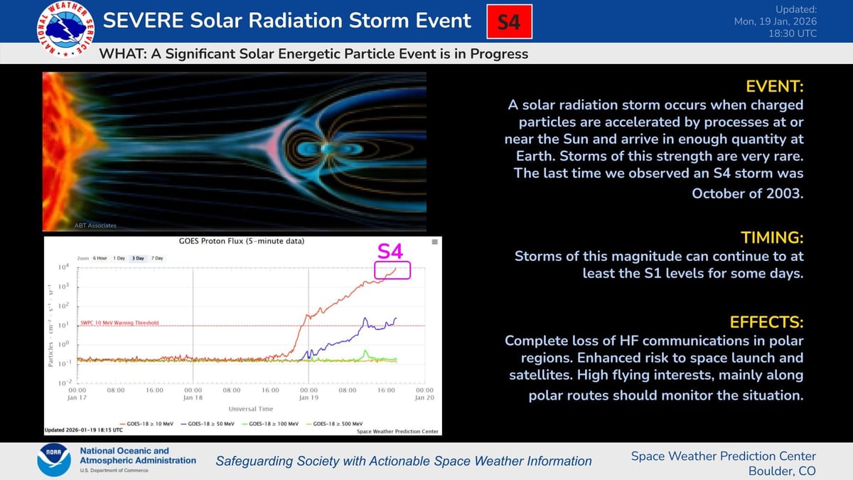 米海洋大気局(NOAA)は、2003年の「ハロウィン嵐」以来となる23年ぶりの大規模な太陽放射線嵐と地磁気嵐が発生していると警告しました。S4クラスの太陽放射線嵐はロケット打ち上げや衛星運用、航空分野に、G4クラスの地磁気嵐は通信障害や電力網への影響、そして北米でのオーロラ発生の可能性を指摘しています。日本の情報通信研究機構(NICT)もプロトン現象や急始型地磁気嵐に関する臨時情報を発出し、警戒を呼びかけています。